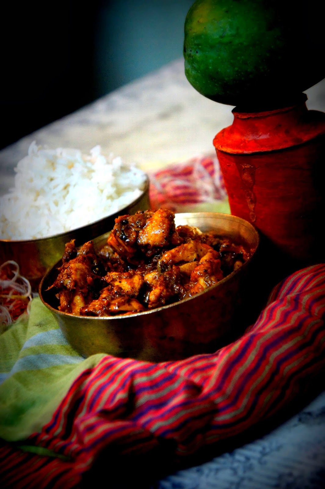 The only thing I look forward to on a hot summer afternoon is the Kancha Aamer Ombol ( a runny chutney of sorts made with raw mangoes and tempered with mustard, usually) and Aam Dal, Dal with raw mangoes in it. My mother makes sure that we have an inexhaustible stock of raw mangoes as long as it an be acquired or all hell would break loose. Yesterday though, I wanted to add raw mangoes to my chicken and came up with this recipe, it fiery, spicy, tangy and sweet and everyone loved it. In fact this week I am going to come up with recipes using raw mangoes, beyond the usual. Fingers crossed.